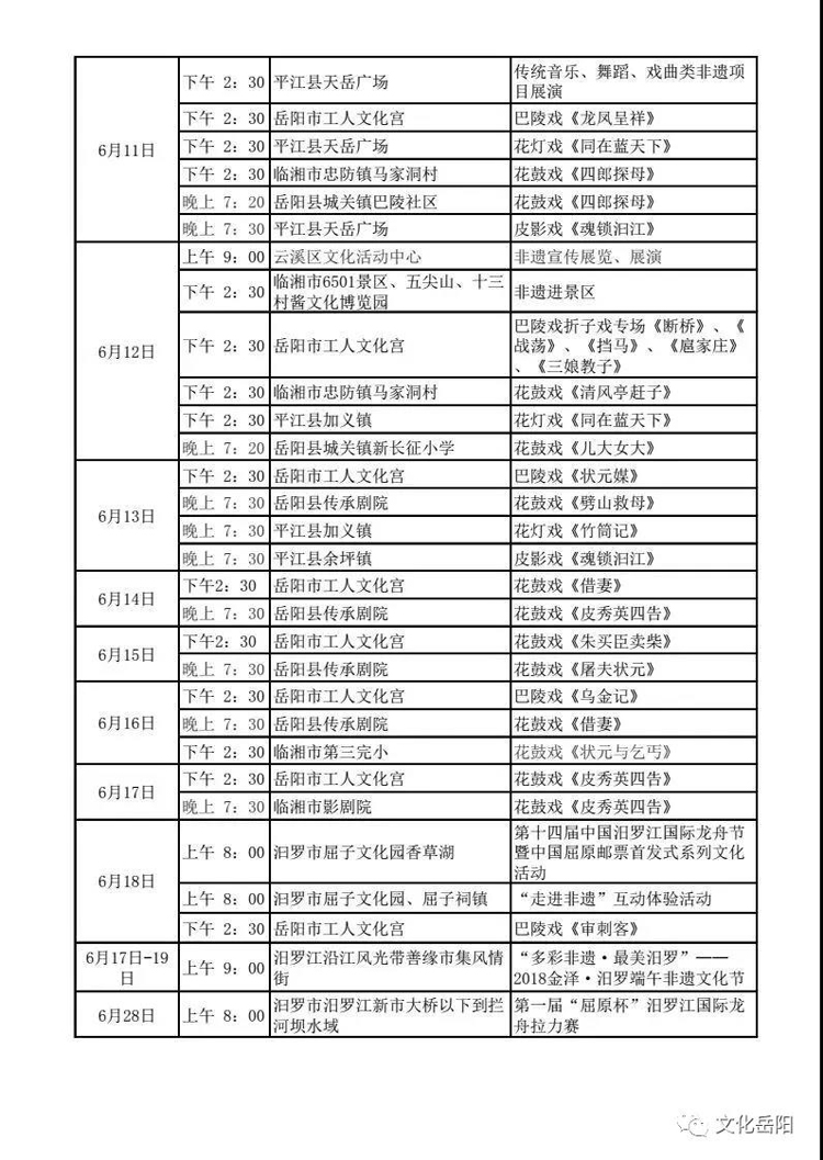 本次活动自5月30日—6月20日,历时20天,分八大活动与两大专题。“八大活动”分别是:召开新闻发布会、临湘主会场启动仪式、为期10天共40场的传统经典剧目展演、《守望历史 记住乡愁——岳阳市非遗保护成果展》全市百所学校巡展、“我是小小传承人”传统文化研学活动、第十四届中国汨罗江国际龙舟节暨中国屈原邮票首发式系列文化活动以及第一届“屈原杯”汨罗江国际龙舟拉力赛、汨罗江畔传统特色饮食文化节、传承人风采展示。“两大专题”为“成果与经验”专题和“屈原与端午”专题。