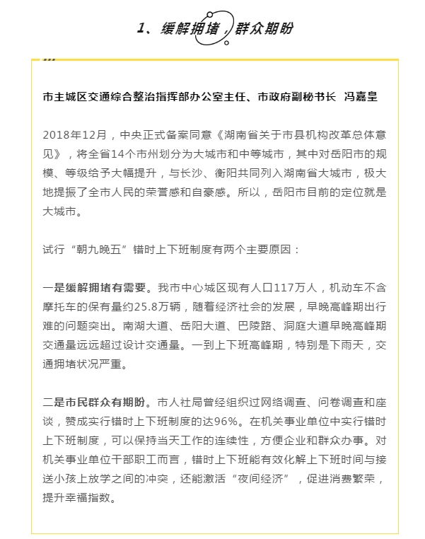 我市早在2018年开始就对市中心城区机关事业单位实行错时上下班制度进行了调研和论证,并由市人社局组织问卷调查。今年,市委市政府在充分调研和反复研究的基础上,为了缓解市中心城区交通拥堵现状、提高政府工作效能、保护城市生态环境、方便群众办事,决定在市中心城区机关事业单位试行错时上下班制度。