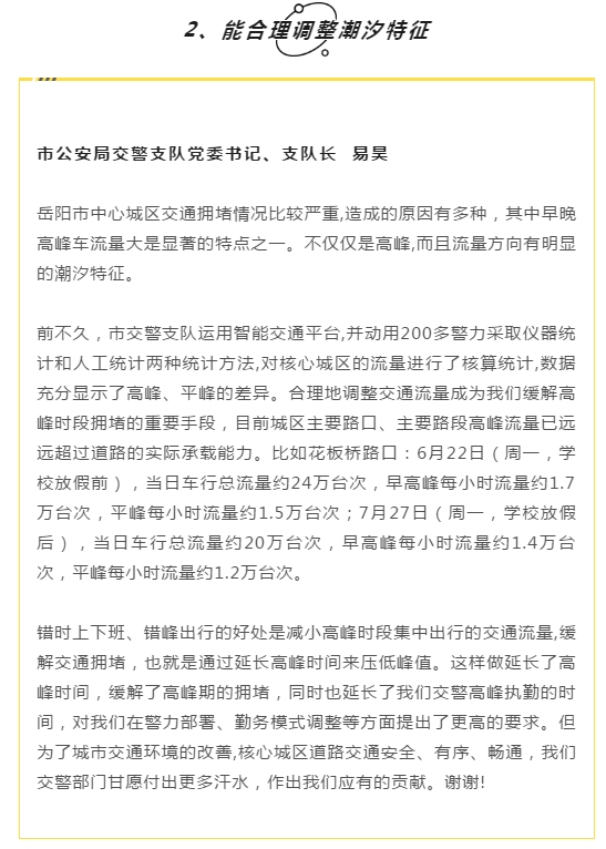 南湖大道、岳阳大道、巴陵路、洞庭大道早晚高峰期交通量分别超过设计交通量的63.6%、38.2%、15.6%、8.1%。错时上下班是在既有道路网络资源的条件下,通过调整不同单位和行业的上下班时间,错开出行高峰时段,达到交通流量时间分布均匀化,缓解交通拥堵。