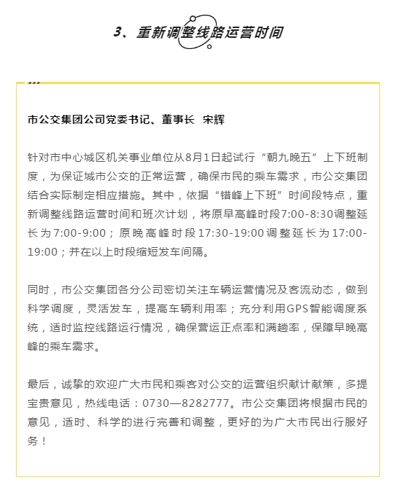 市公交集团将根据错时上下班的实际情况,做好公交运营调整等工作,尽量满足群众出行需求。市教体局将做好学校、幼儿园作息相关工作。市中心城区各级各部门单位将密切关注试行错时上下班制度可能出现的新情况、新问题,及时采取有效措施予以解决,确保错时上下班制度顺利实施。