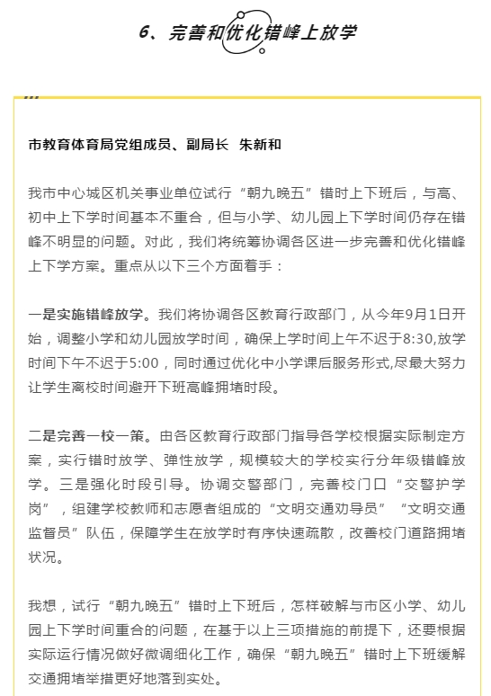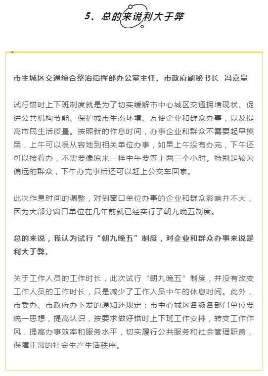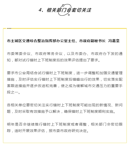我市将进一步细化工作举措,完善配套制度,开展对市中心城区机关事业单位试行错时上下班制度实施情况的效果评估。在此也请大家予以关注,多多收集相关的意见和建议,为破解市中心城区交通拥堵难题提供更多的民意支持。