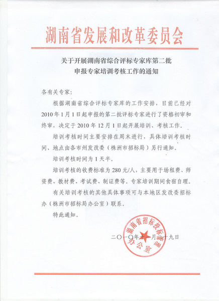 湖南省综合评标专家库第二批申报专家培训考核时间安排暂定稿