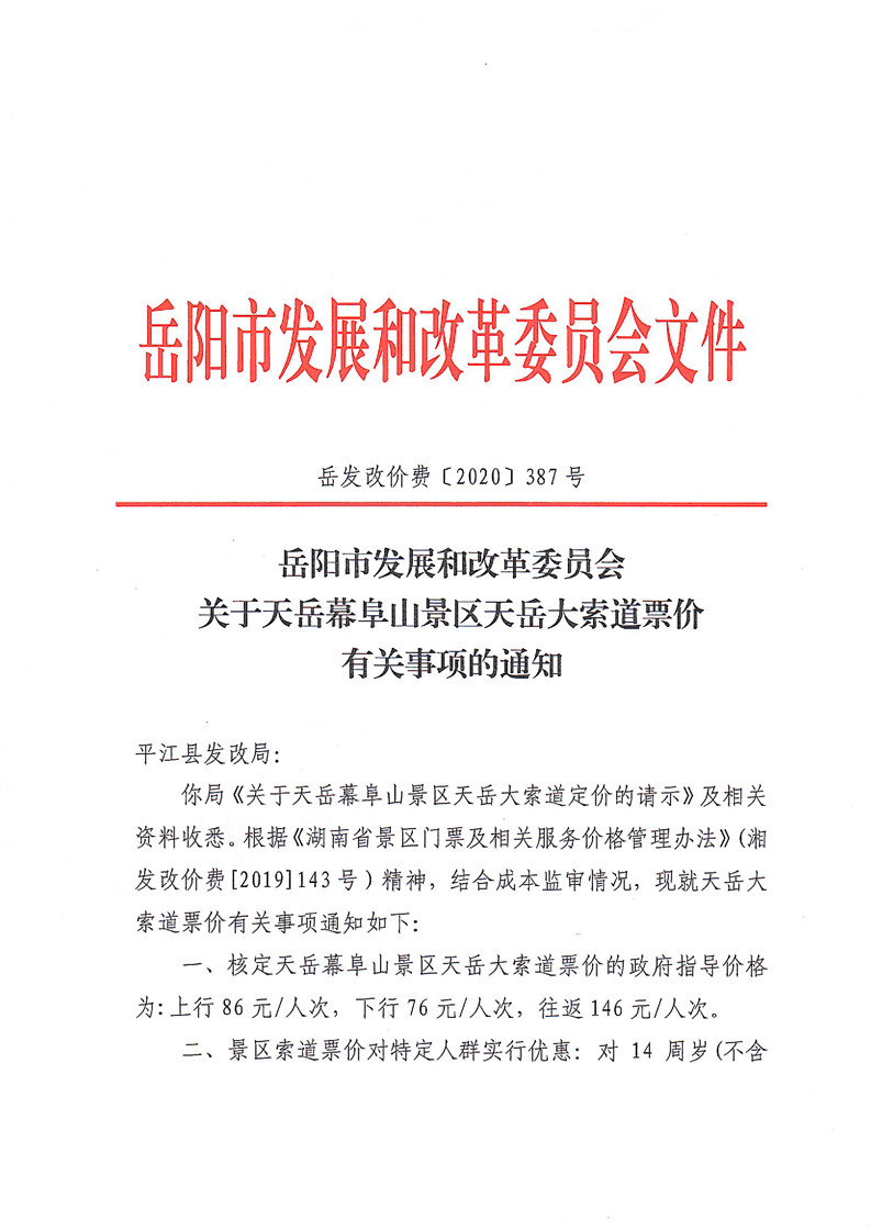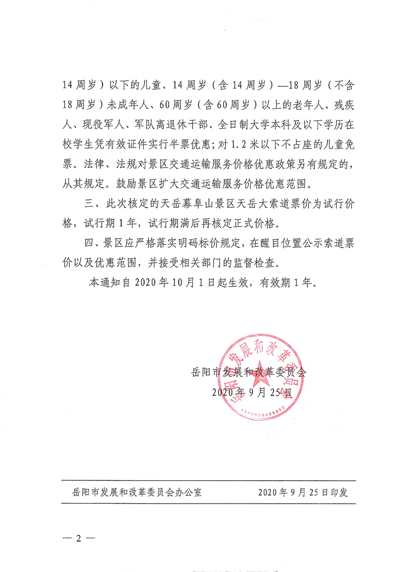 关于天岳幕阜山景区天岳大索道票价有关事项的通知