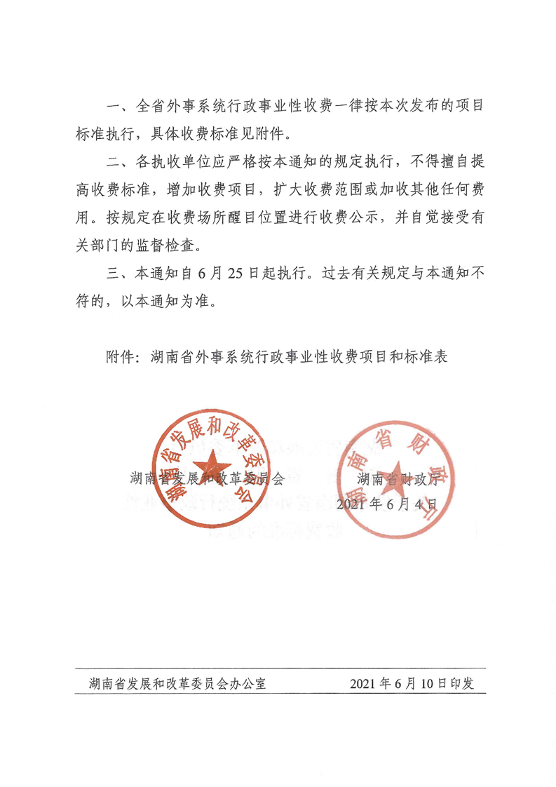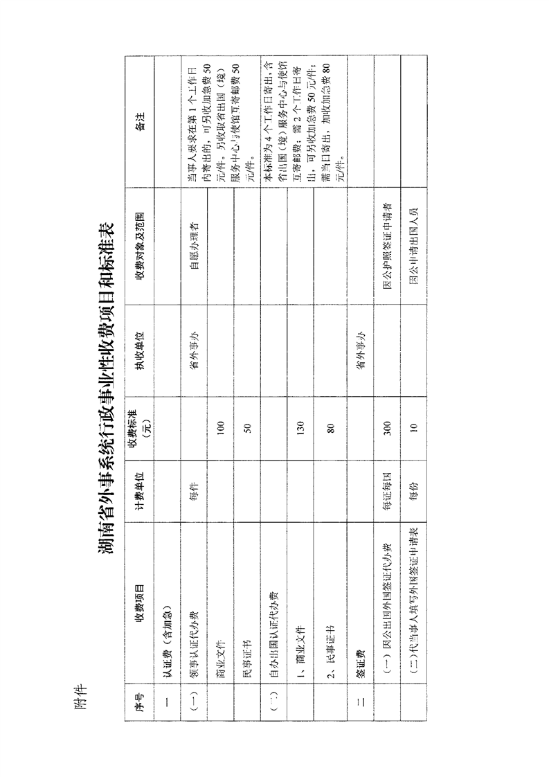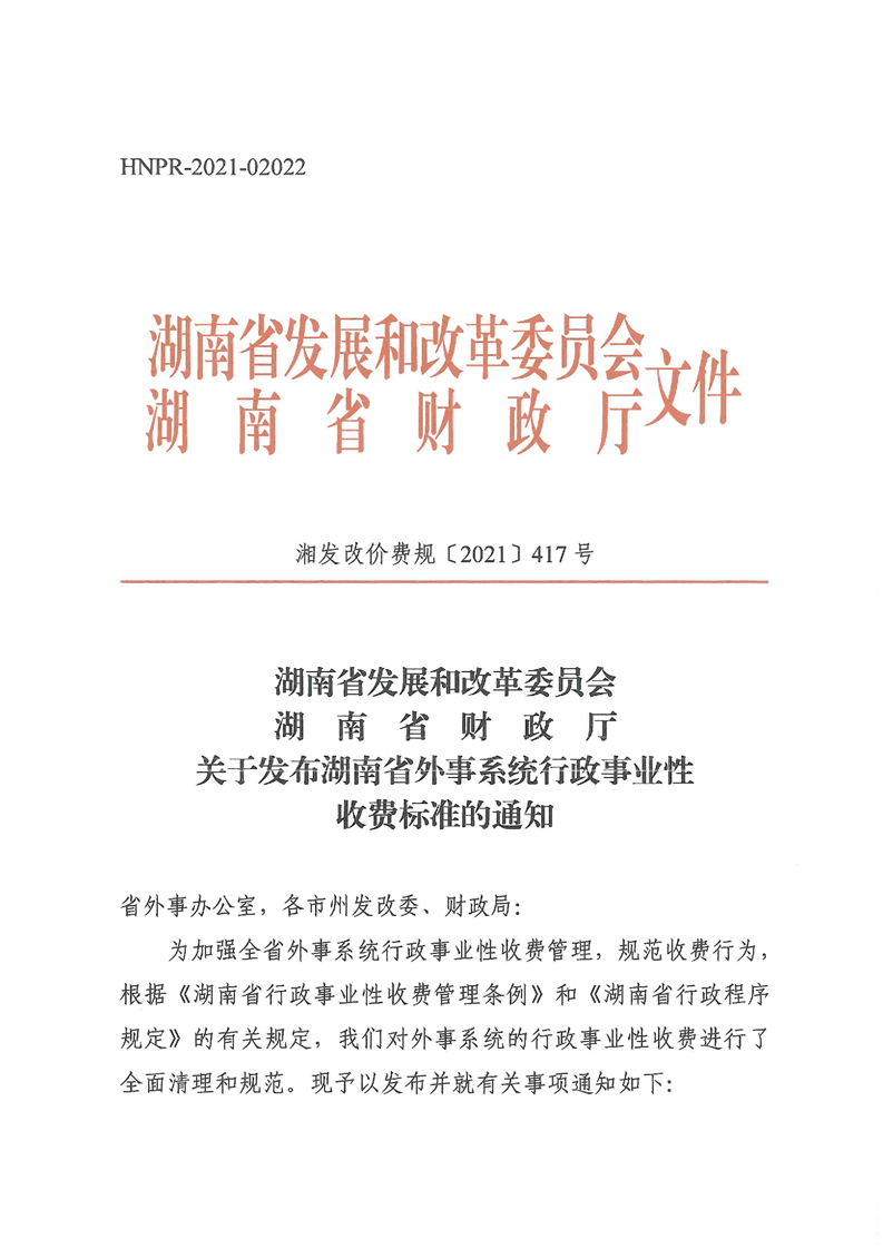 关于发布湖南省外事系统行政事业性收费标准的通知