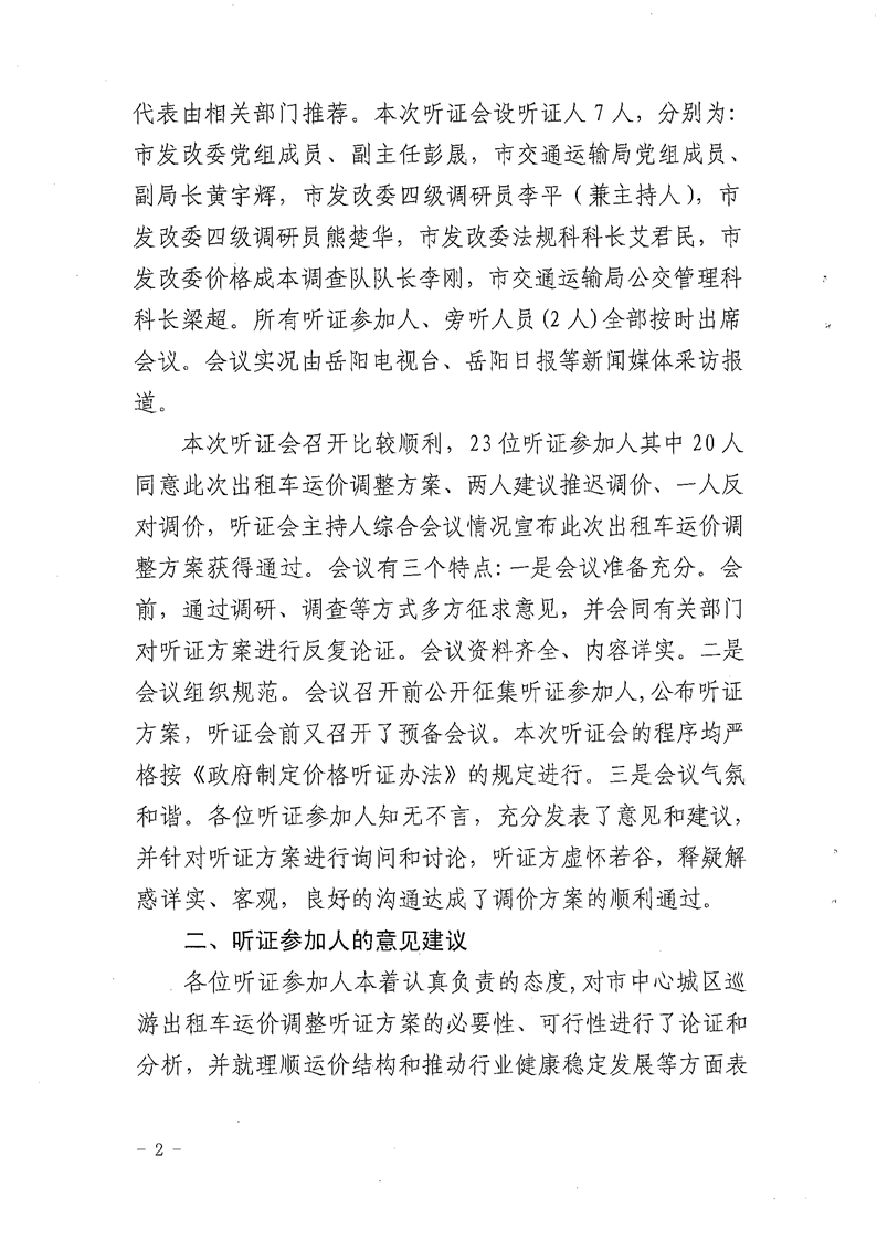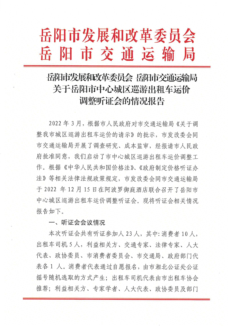 关于岳阳市中心城区巡游出租车运价调整听证会的情况报告