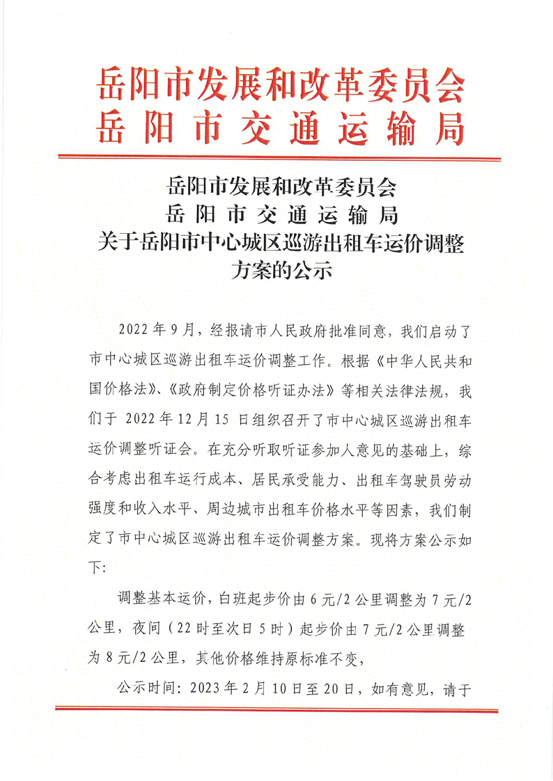 关于岳阳市中心城区巡游出租车运价调整方案的公示