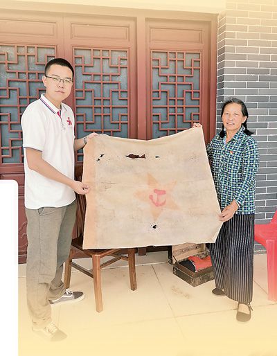 记者刘佳华(左)在广西灌阳县与李清鸾老人展示当年红军战士留下的一面红旗(复制品)。俸顺喜摄