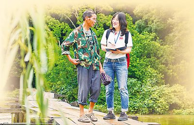 记者黄娴(右)在贵州黎平县采访红军桥的故事。涂 敏摄