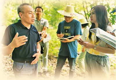 记者邝西曦(左)在广西兴安县采访了解当年红军翻越老山界的路线。庄慧琼摄