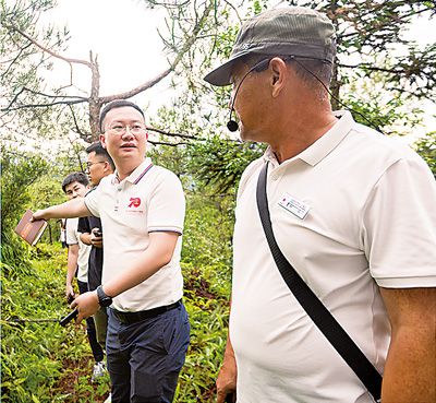 记者颜珂(右二)跟随红军后代重访福建长汀县松毛岭战场。焦 艳摄