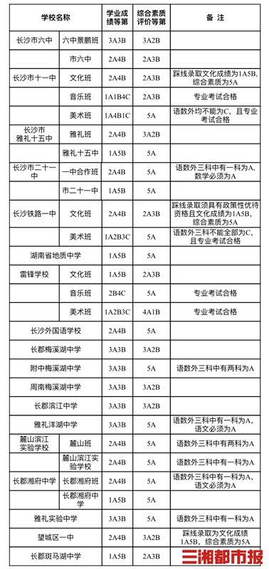 本批次普高学校备受关注的梅溪湖畔三所学校——长郡梅溪湖中学、师大附中梅溪湖中学、周南梅溪湖中学录取线学业水平考试成绩要求均为3A3B,但在综合素质评价等级和语数外三科的等级要求上略有不同。此外,长郡滨江中学、雅礼洋湖中学以及首次招收高中生的雅礼实验中学要求的学业成绩等级均为3A3B。