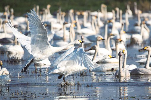 (2020年11月13日,岳阳市屈原管理区东古湖湿地,成群结队的天鹅或在水中游弋,或在空中翱翔,蔚为壮观。周洋 摄)