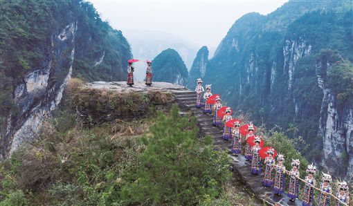 3月15日,矮寨奇观景区,苗族姑娘身着民族服饰在天问台迎接远道而来的客人。记者 辜鹏博 郭立亮 摄影报道