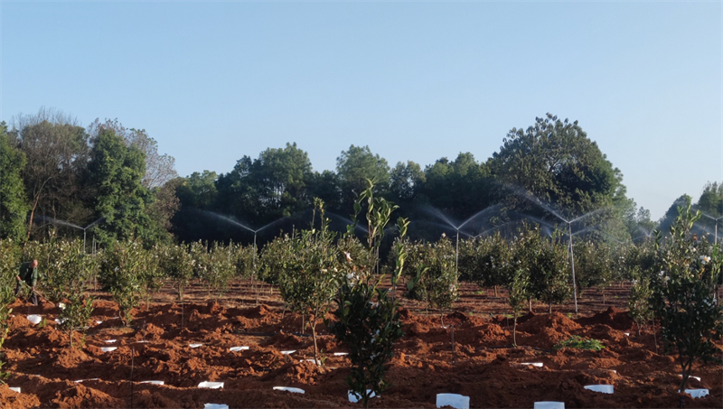 在油茶良种良法示范园里,记者看到,一根根2米多高的灌溉喷头正旋转着喷洒水肥,在田梗上,还铺设了滴灌设备,这些管道连接着多个喷头,将水和肥料精准地输送到每一棵油茶树。