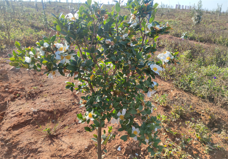 初冬时节,湖南省衡南县云集街道普贤村的山坡上,5000余亩的油茶基地里,洁白的油茶花在枝头盈盈绽放,散发出淡淡的清香,林下套种的中药材桔梗也开着紫色小花,一派兴旺景象。