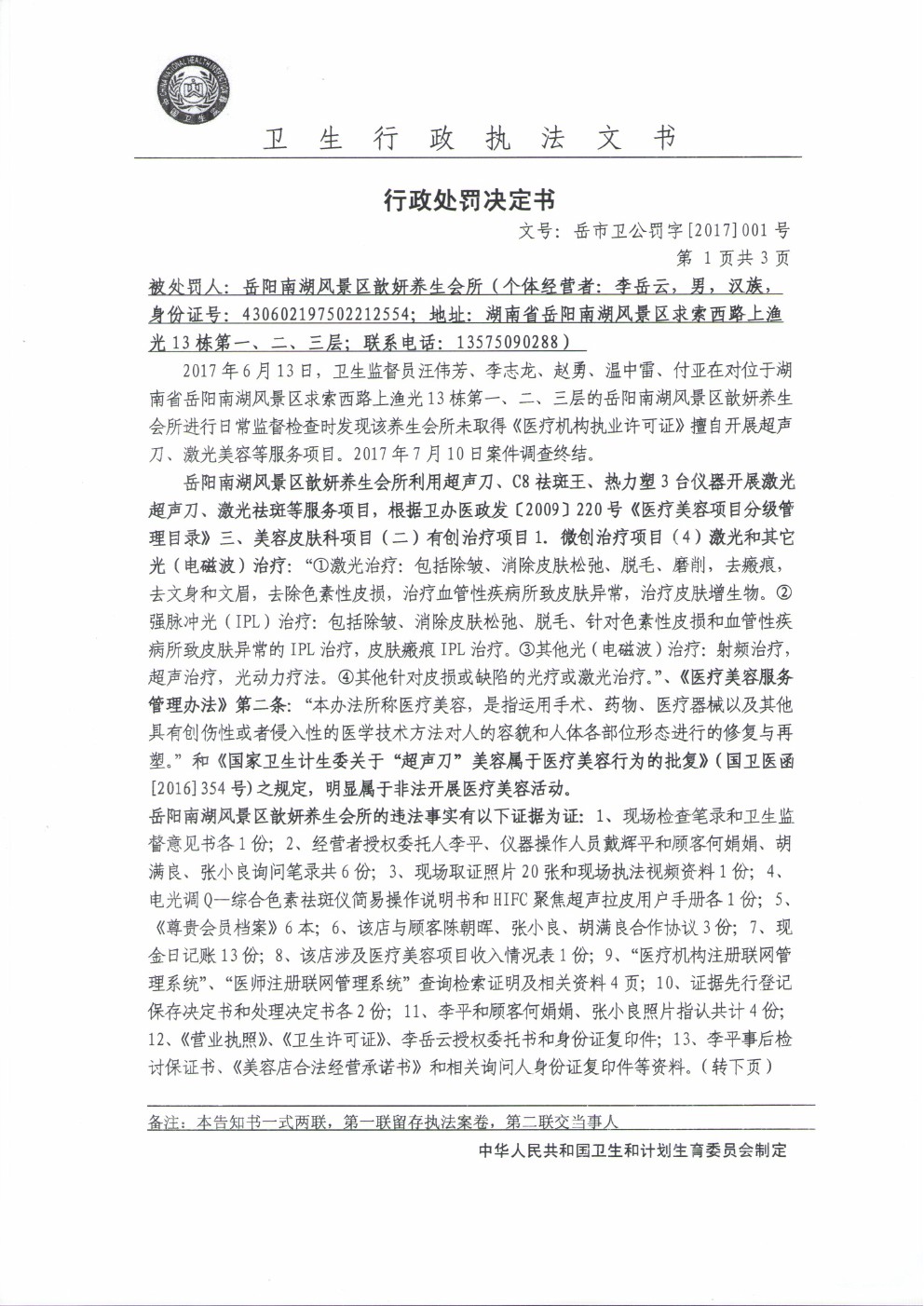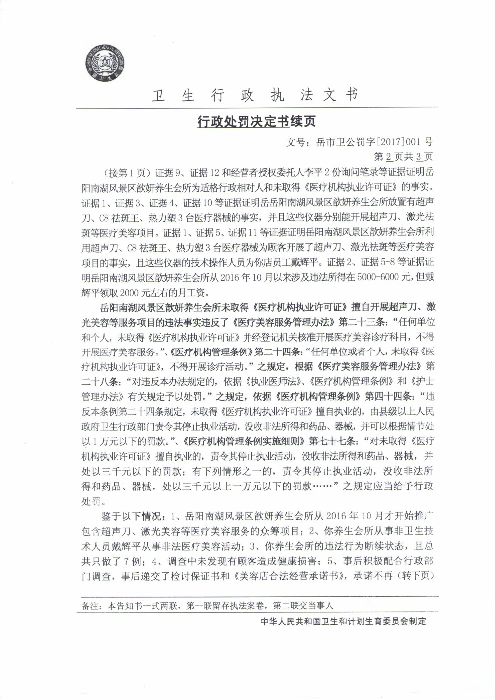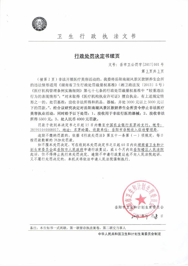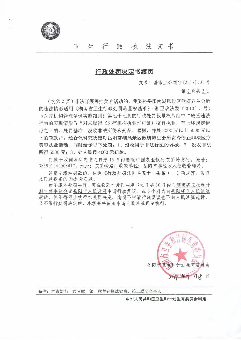 行政处罚决定书(岳市卫公罚字[2017]001号)