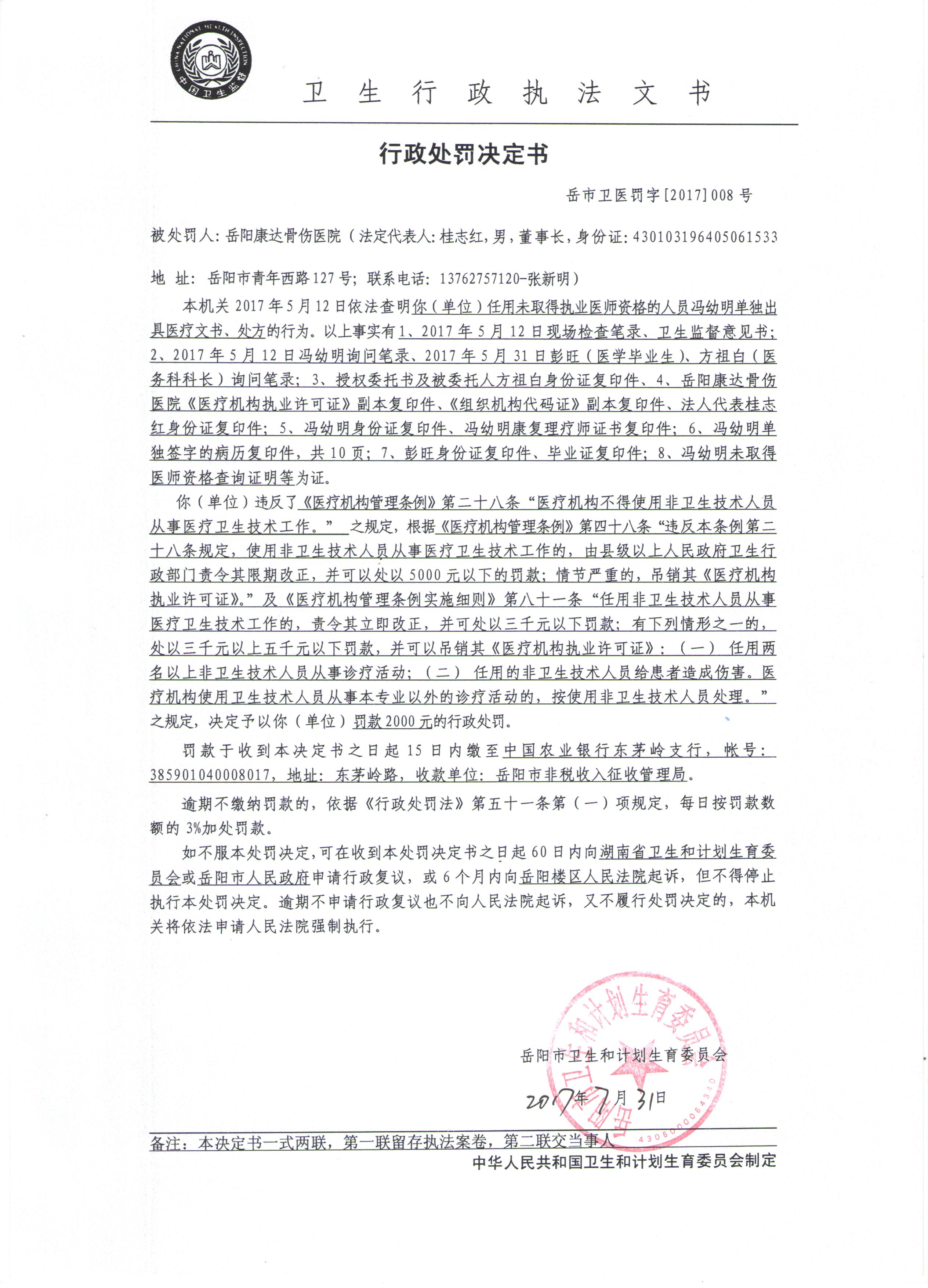 行政处罚决定书(岳市卫医罚字[2017]008号)