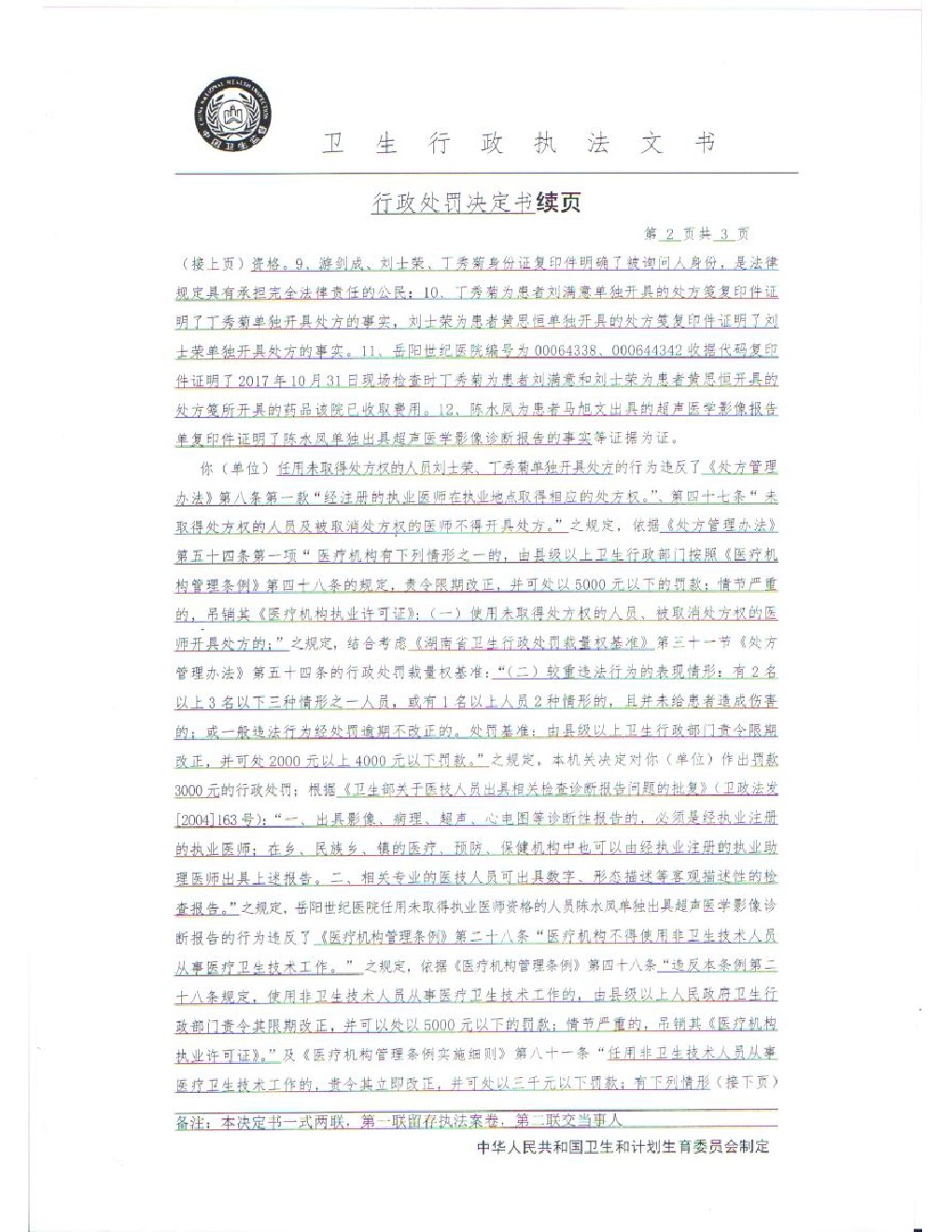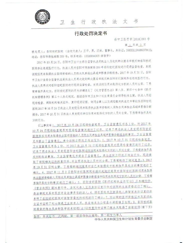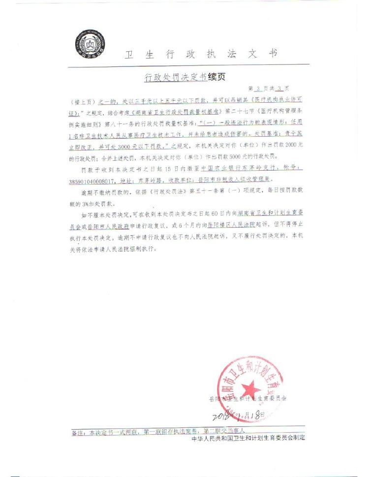 行政处罚决定书(岳市卫医罚字[2018]001号)
