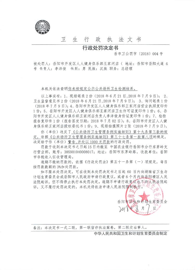 行政处罚决定书(岳市卫公罚字[2018]004号)