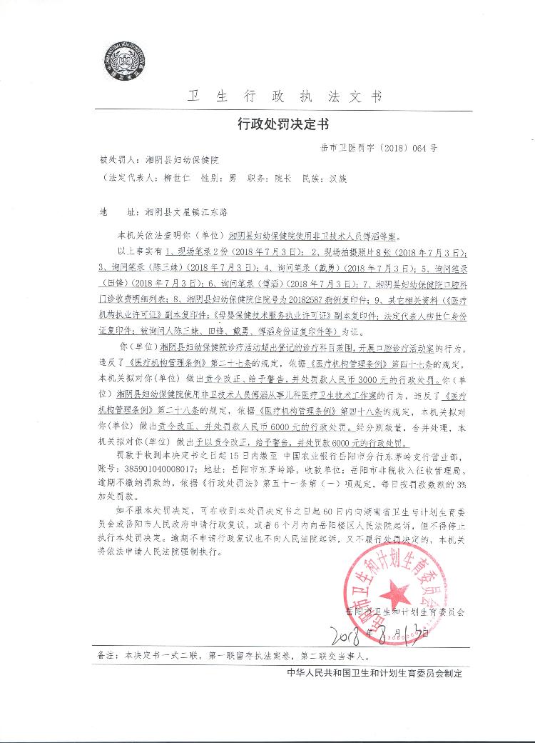 行政处罚决定书(岳市卫医罚字[2018]064号)
