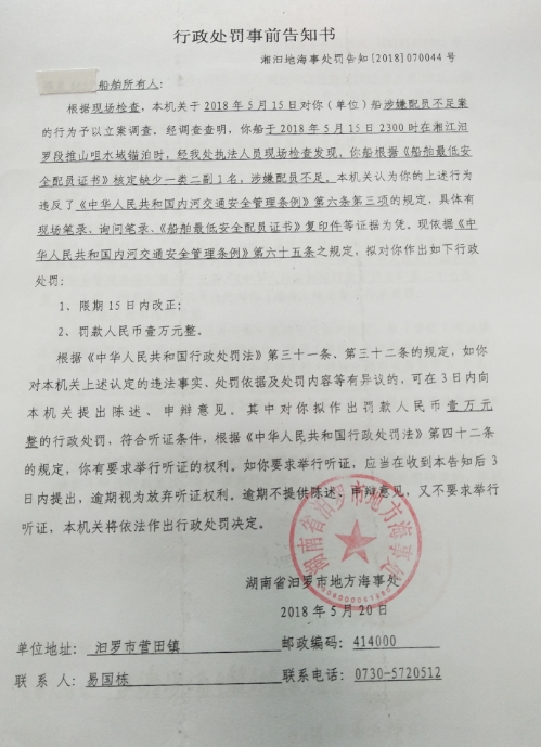 湘汨地海事处罚告知[2018]070044号