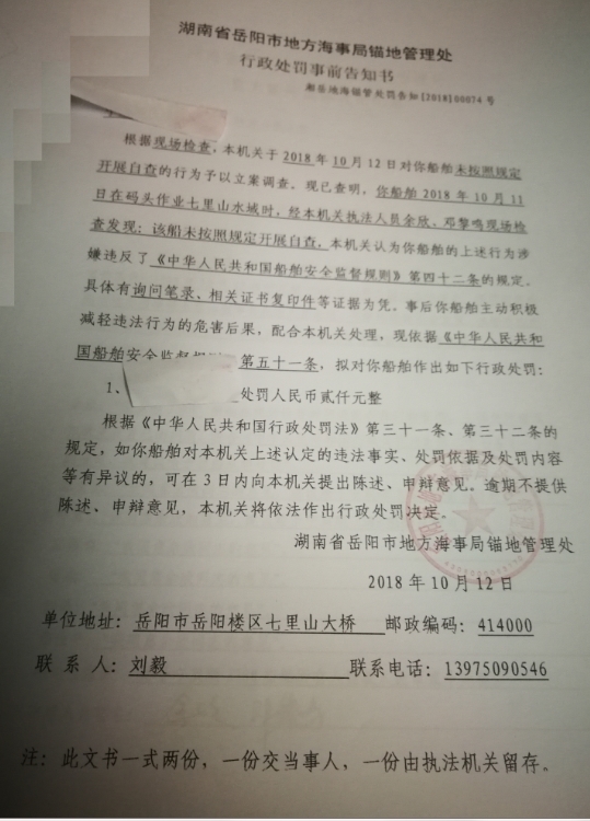 湘岳地海锚管处罚告知[2018]00074号