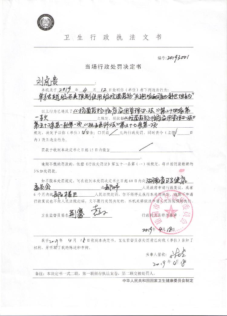 当场行政处罚决定书(20193001)