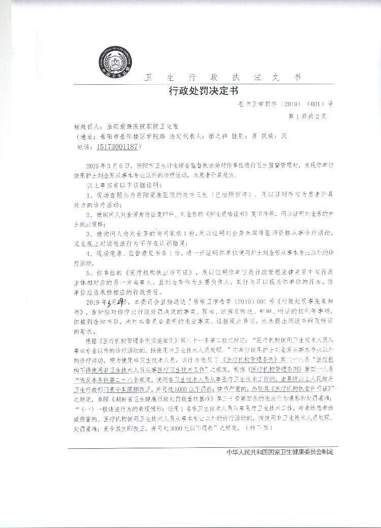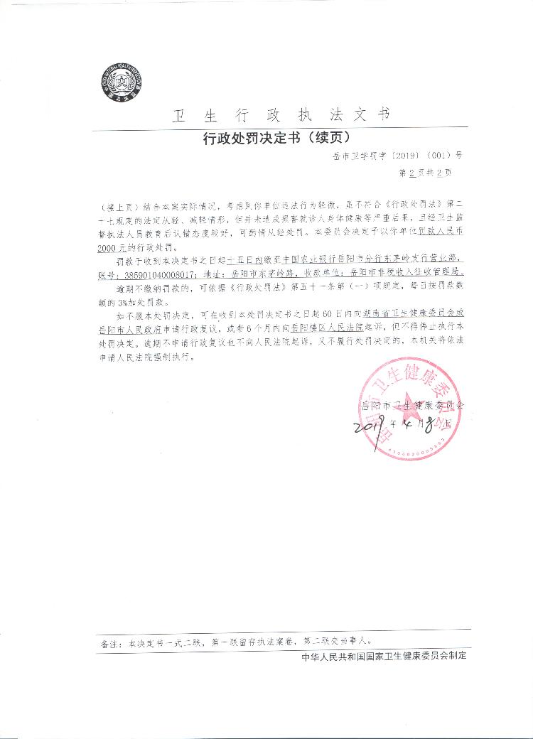 行政处罚决定书(岳市卫学罚字[2019]001号)