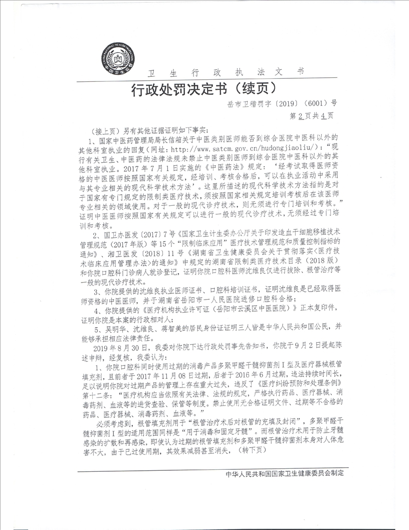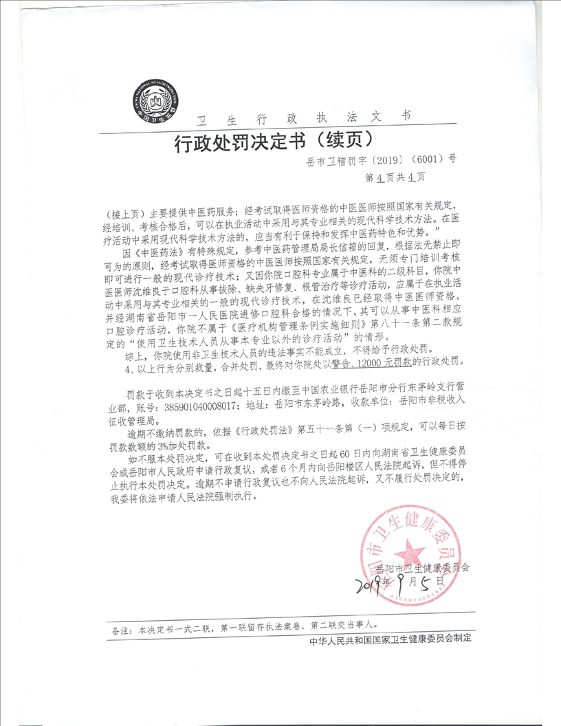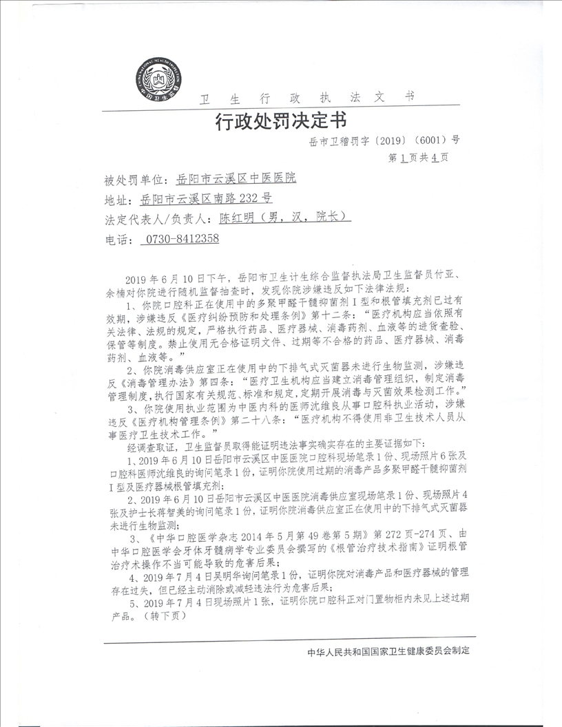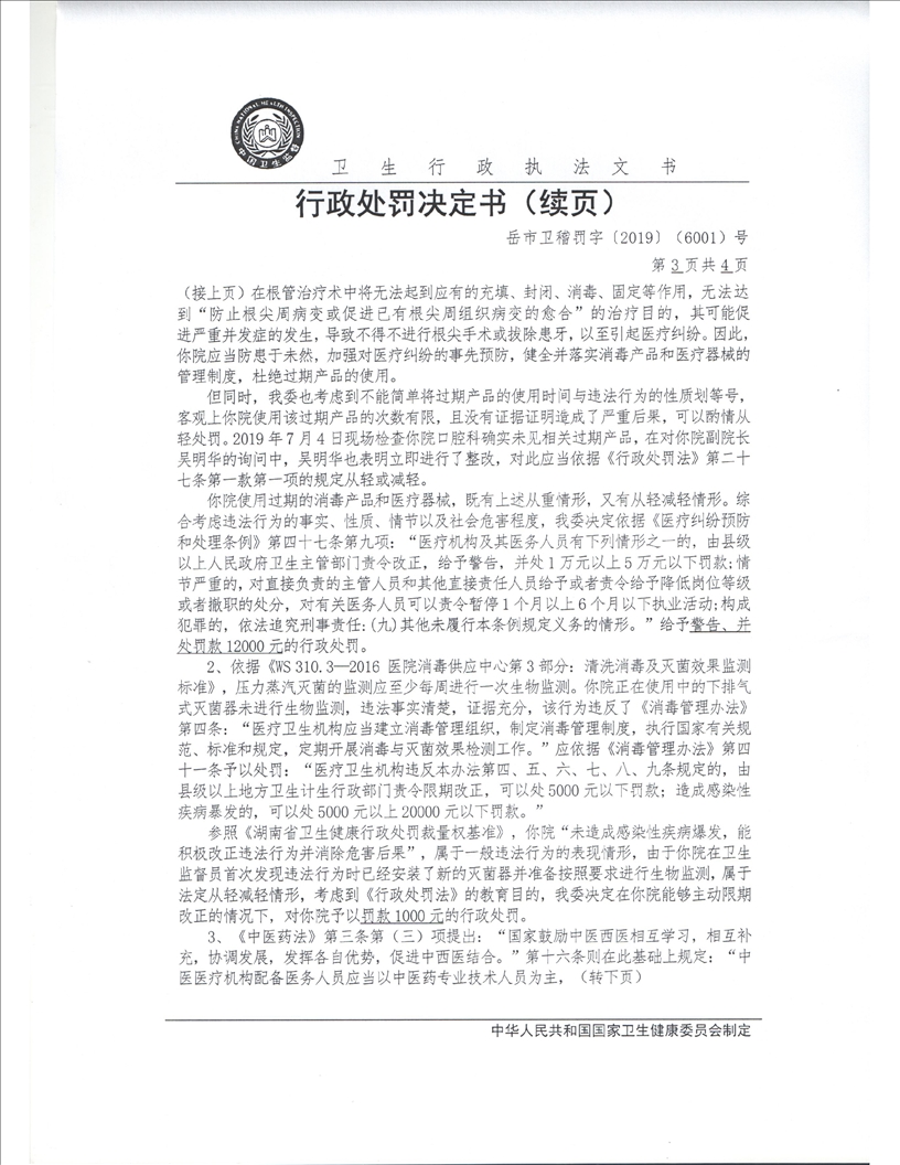 行政处罚决定书(岳市卫稽罚字[2019]6001号)