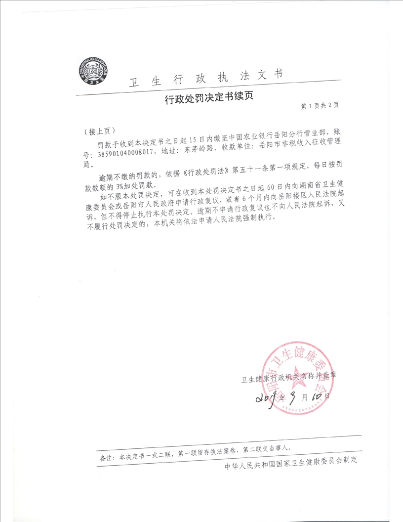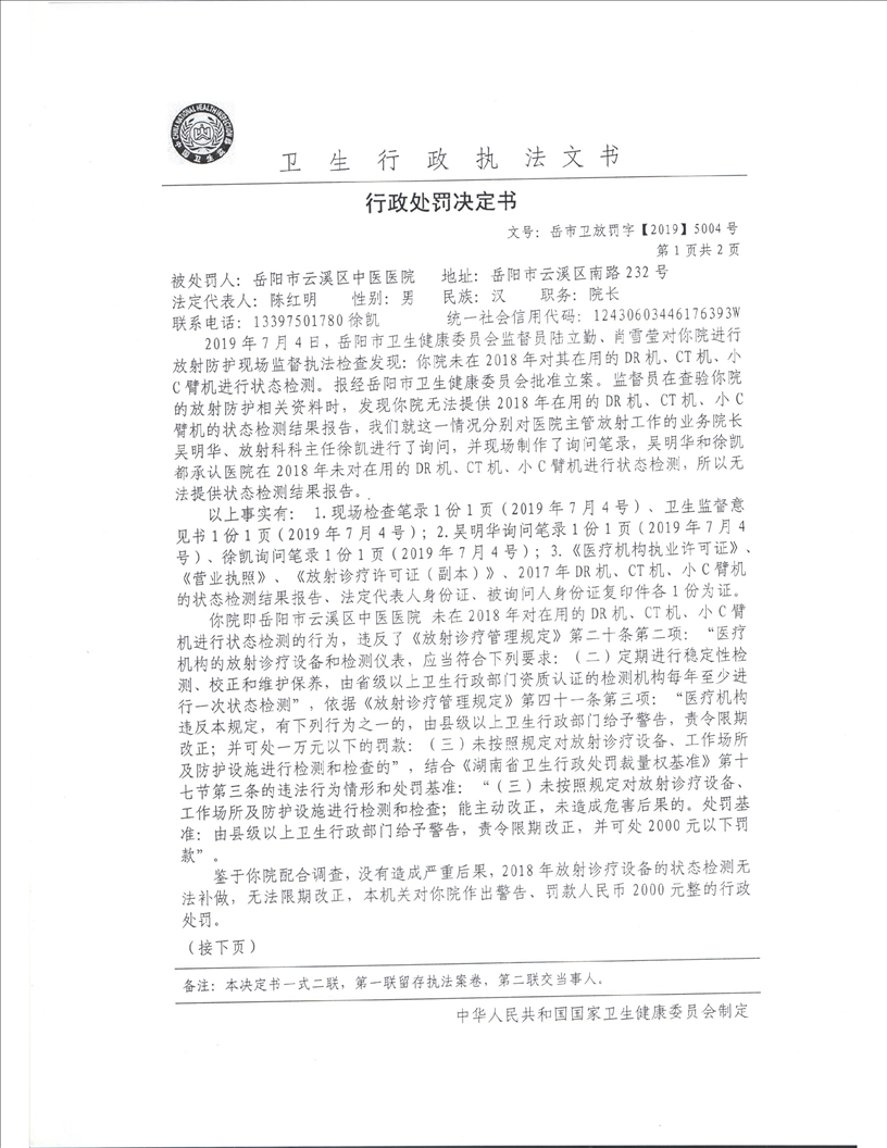行政处罚决定书(岳市卫放罚字[2019]5004号)