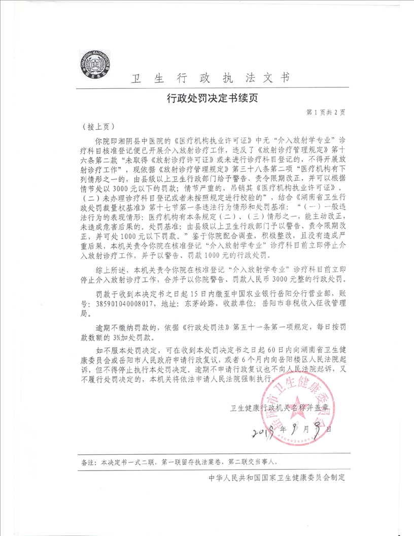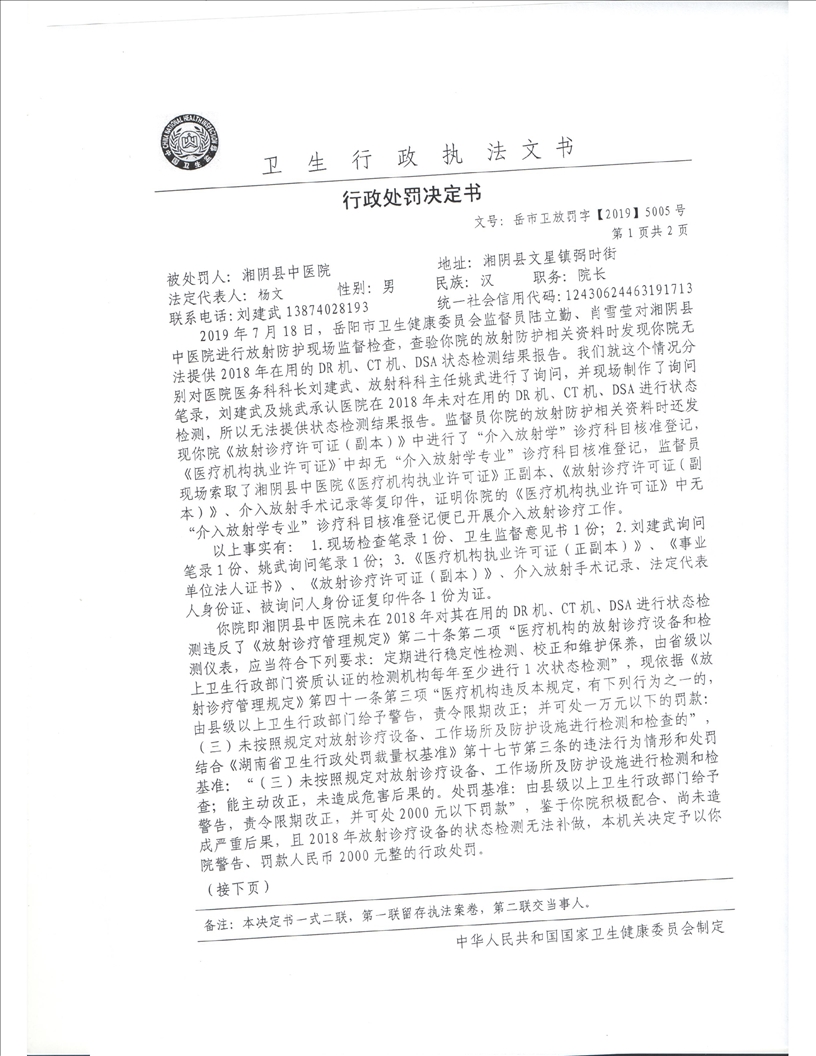 行政处罚决定书(岳市卫放罚字[2019]5005号)