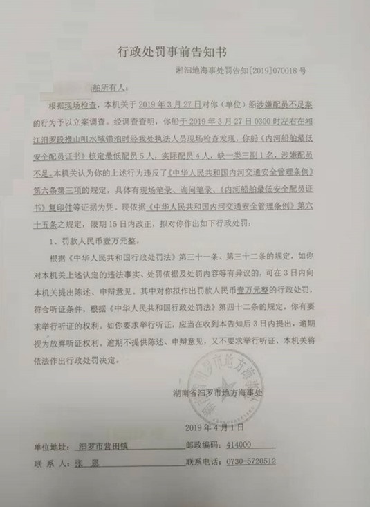 湘汨地海事处罚告知[2019]070018号