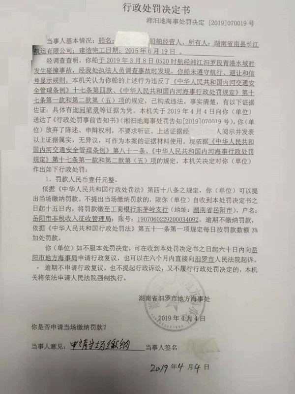 湘汨地海事处罚决定[2019]070019号