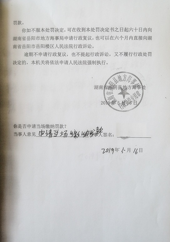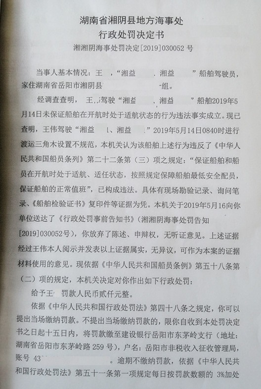 湘湘阴海事处罚决定[2019]030052号