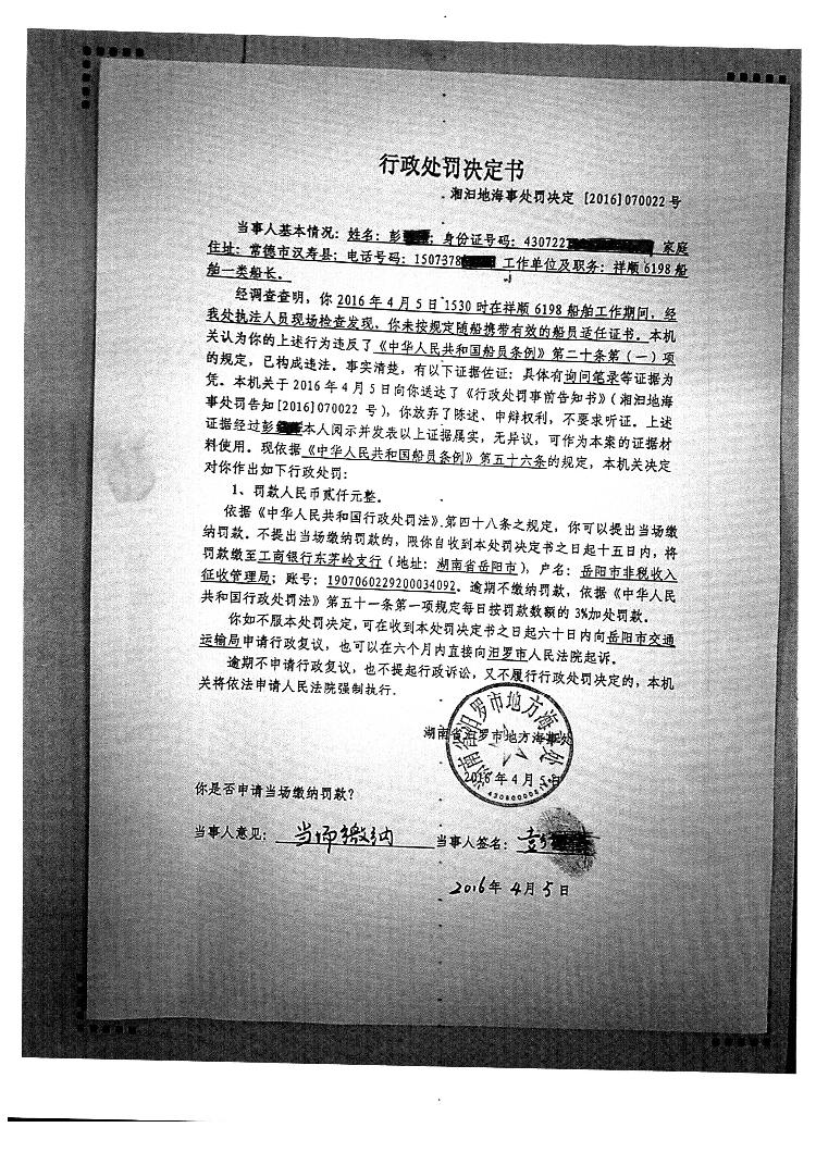 湘汨地海事处罚决定【2016】070022