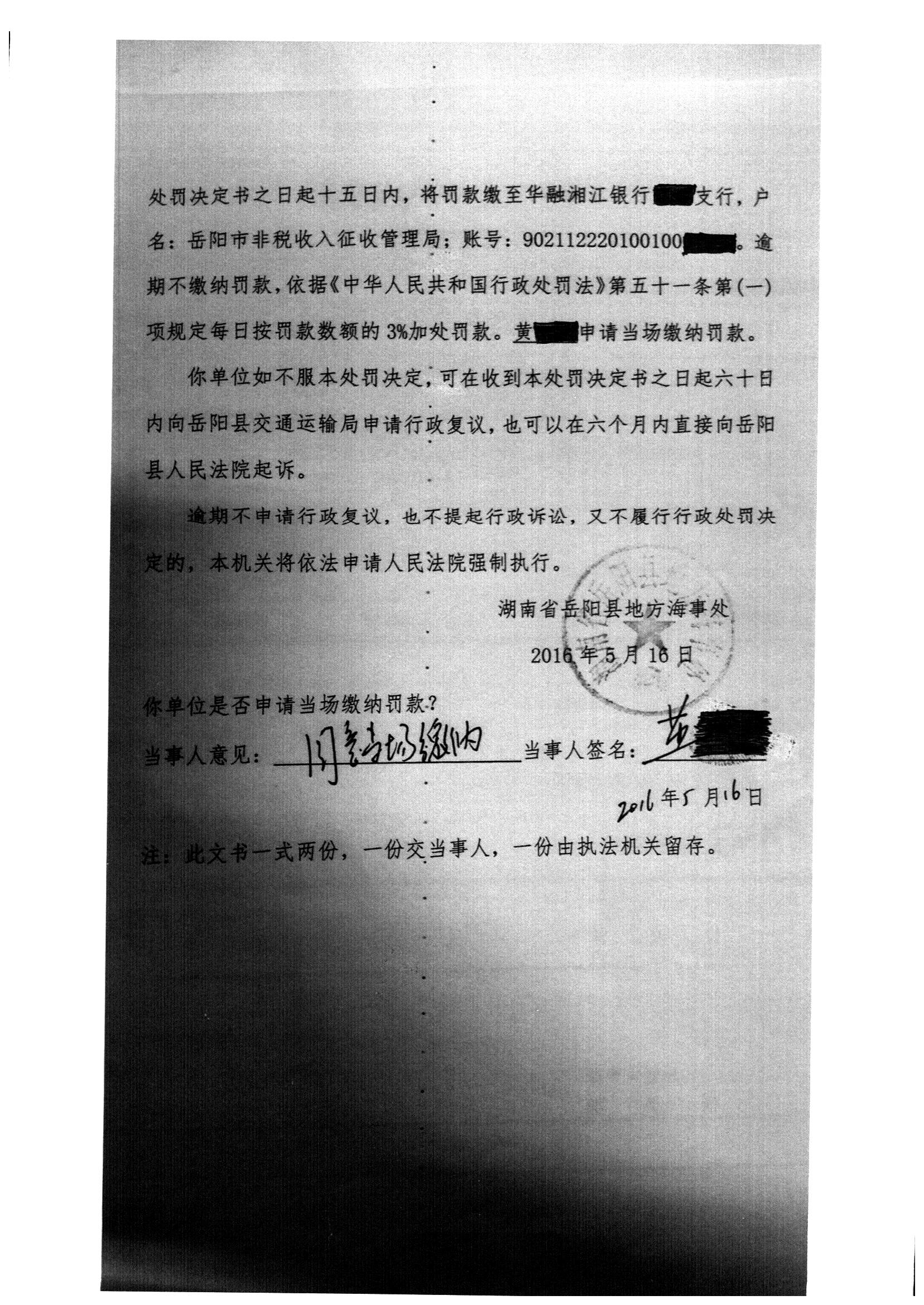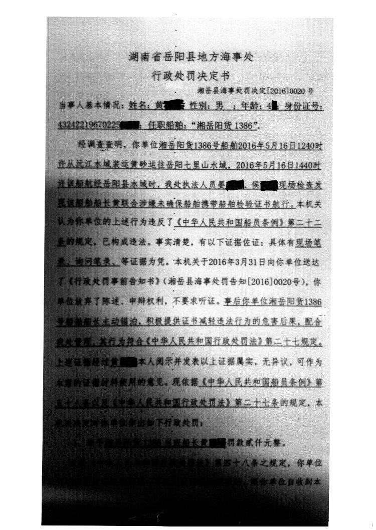 湘岳县海事处罚决定[2016]0020号
