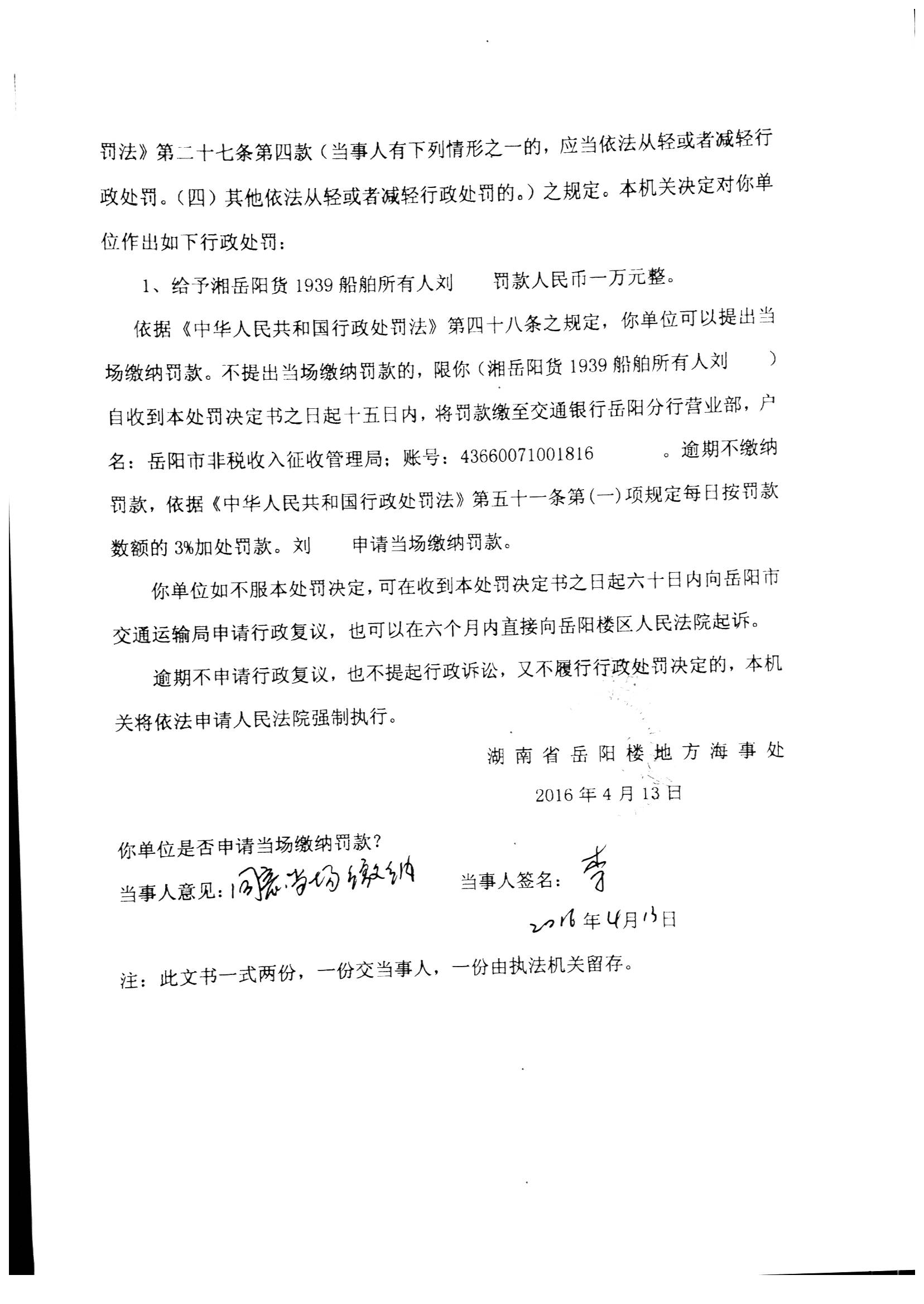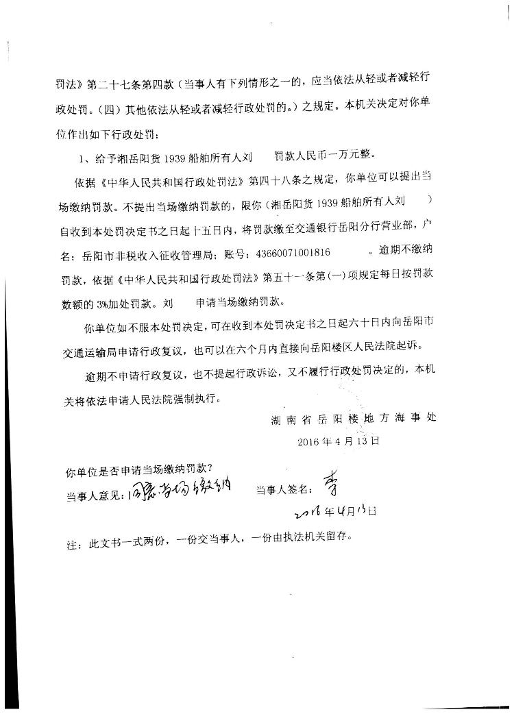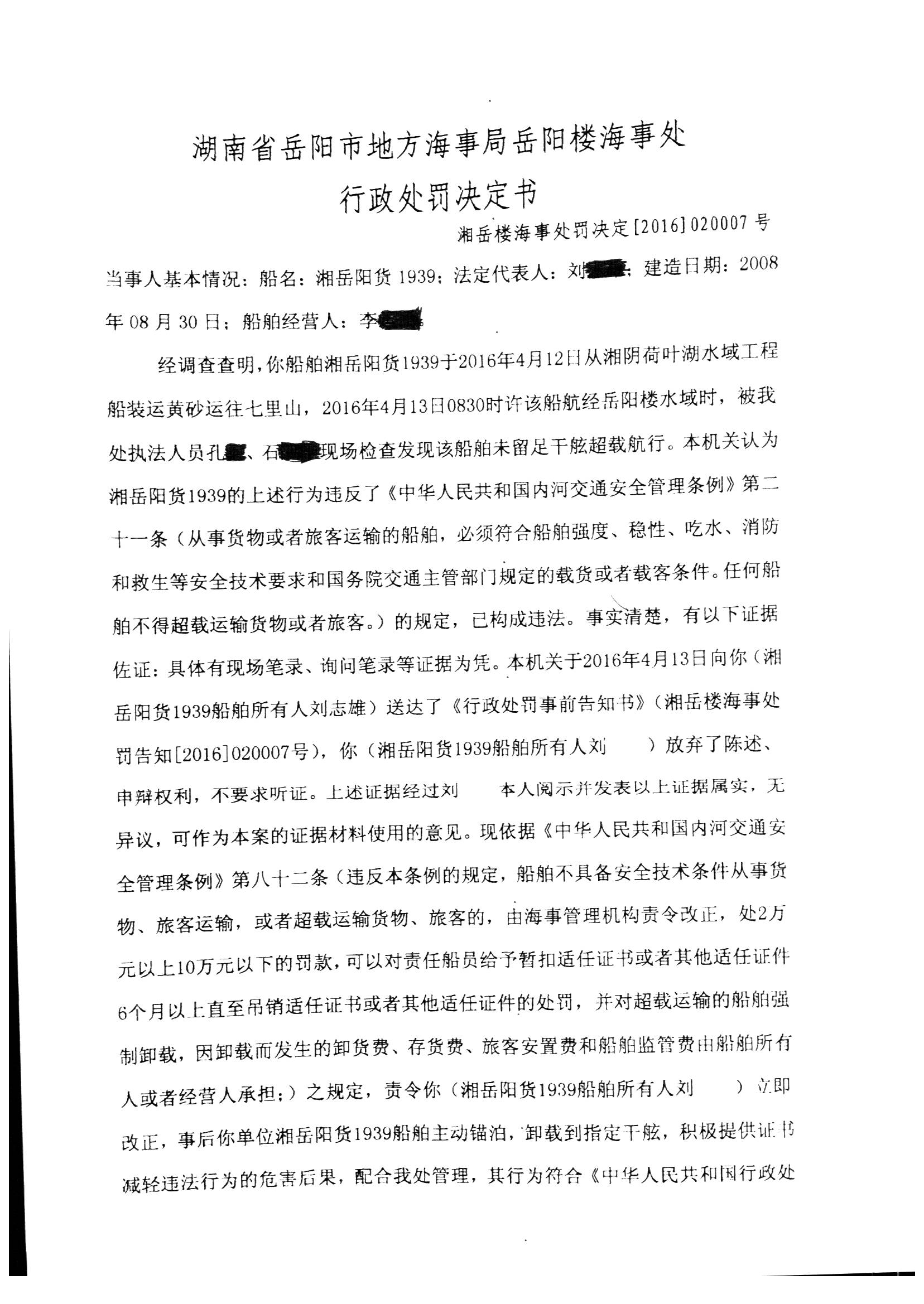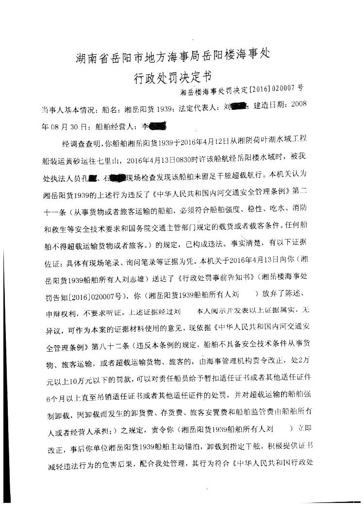 湘岳楼海事处罚决定[2016]020007号