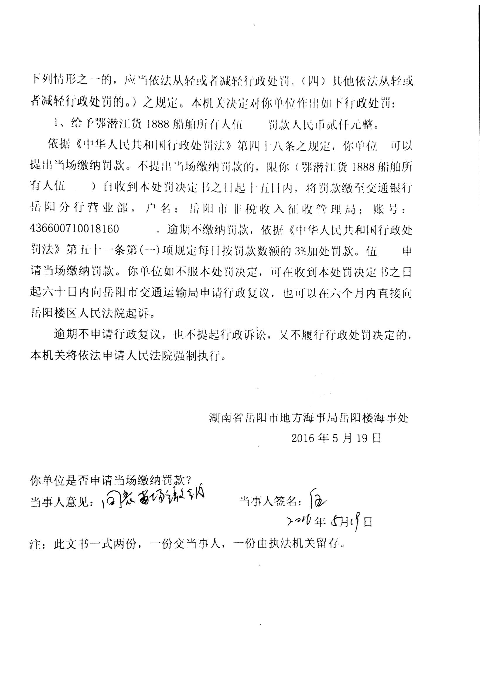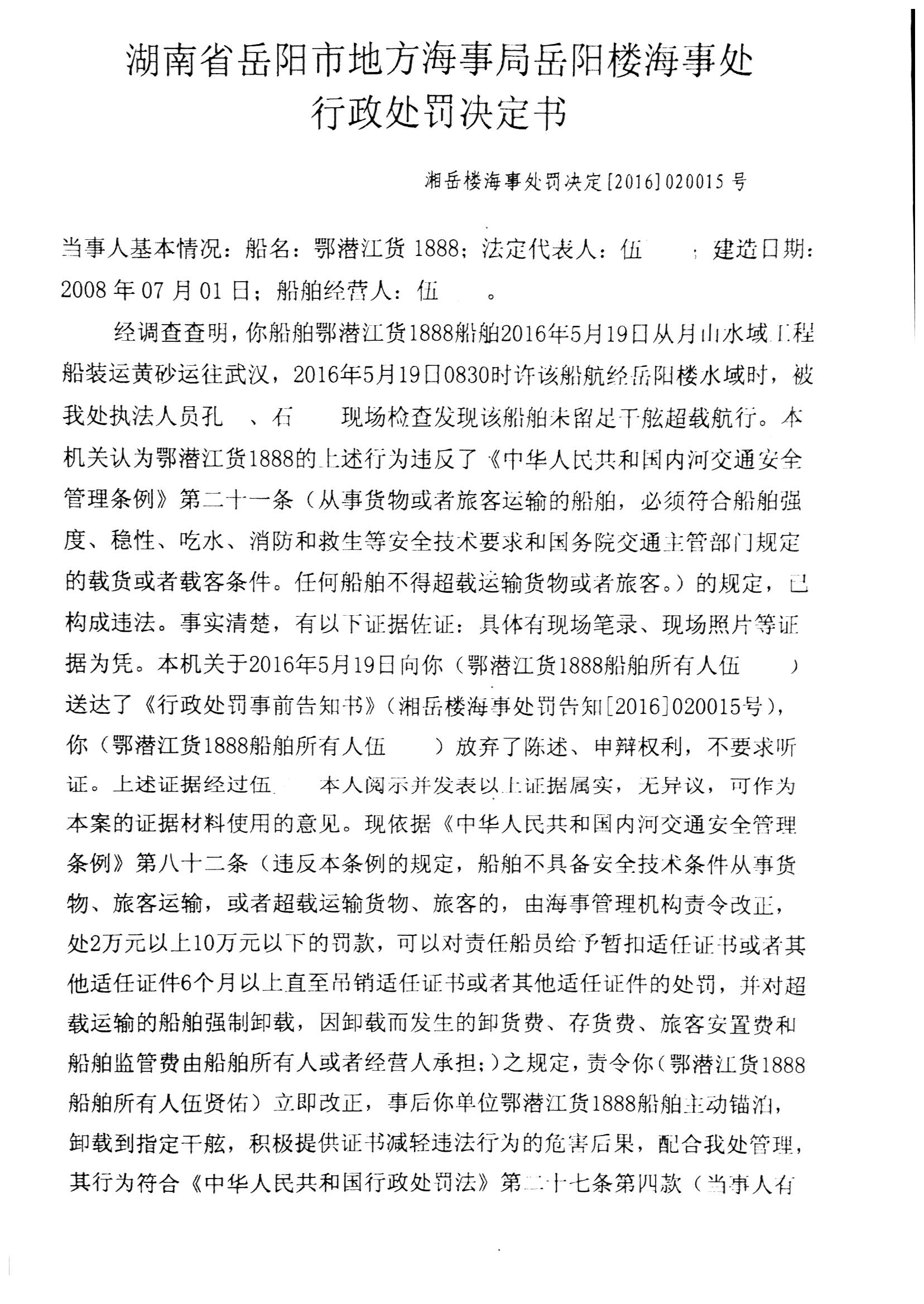 湘岳楼海事处罚决定[2016]020015号