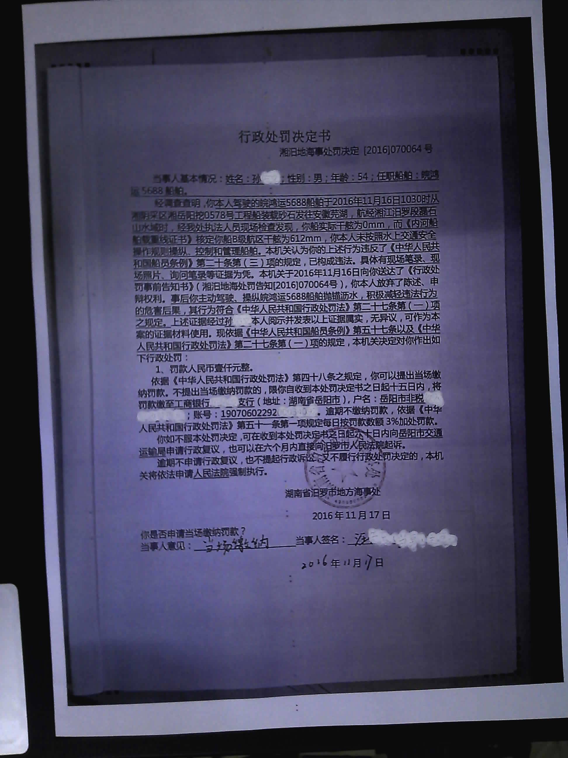 湘汩地海事处罚决定[2016]070064号