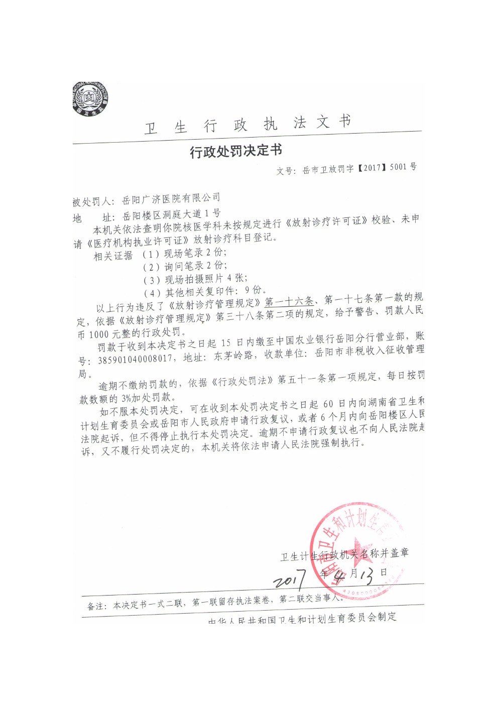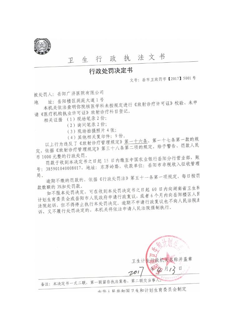 行政处罚决定书(岳市卫放罚字〔2017〕5001号)