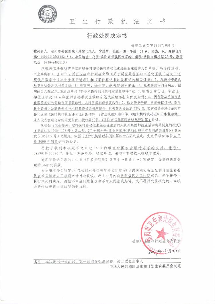 行政处罚决定书(岳市卫医罚字〔2017〕001号)