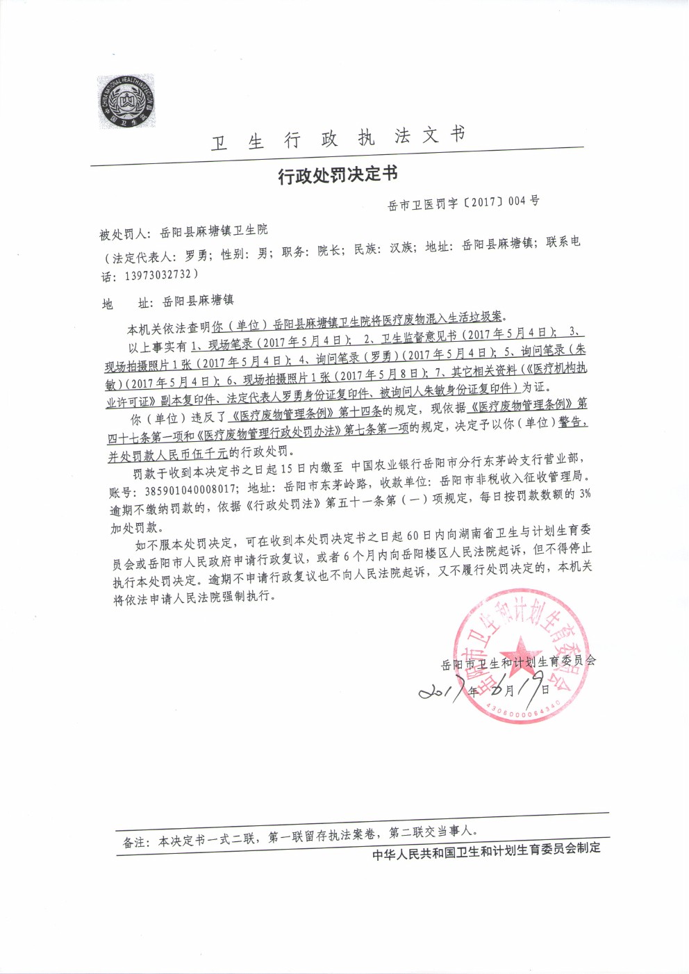 行政处罚决定书(岳市卫医罚字〔2017〕004号)