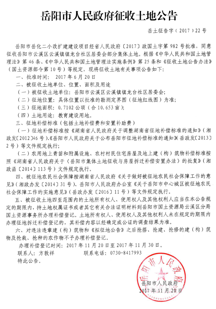 岳阳市岳化二小改扩建建设项目征收土地公告〔2017〕22号