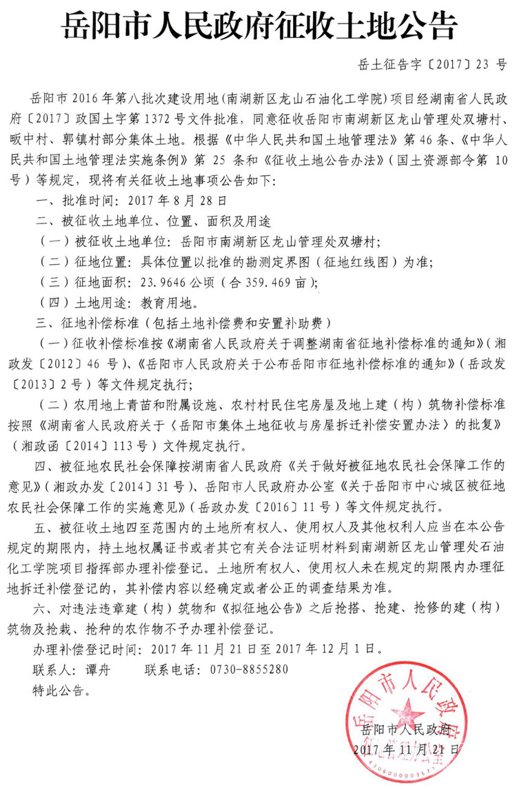 岳阳市2016年第八批次建设用地〔南湖新区龙山石油化工学校〕项目征地公告〔2017〕23号