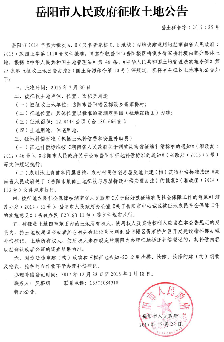岳阳市2014 年第六批次A、B地块(又名胥家桥C,E地块)项目征收土地公告〔2017〕25号