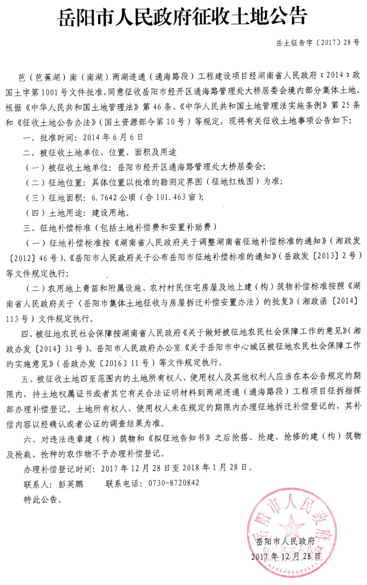芭(芭蕉湖)南(南湖)两湖连通(通海路段)工程建设项目征收土地公告〔2017〕28号