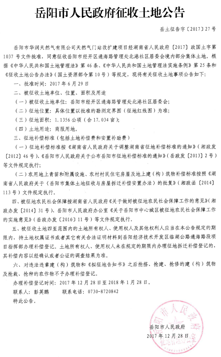 岳阳市华润天然气有限公司天然气门站改扩建建设项目征收土地公告〔2017〕27号