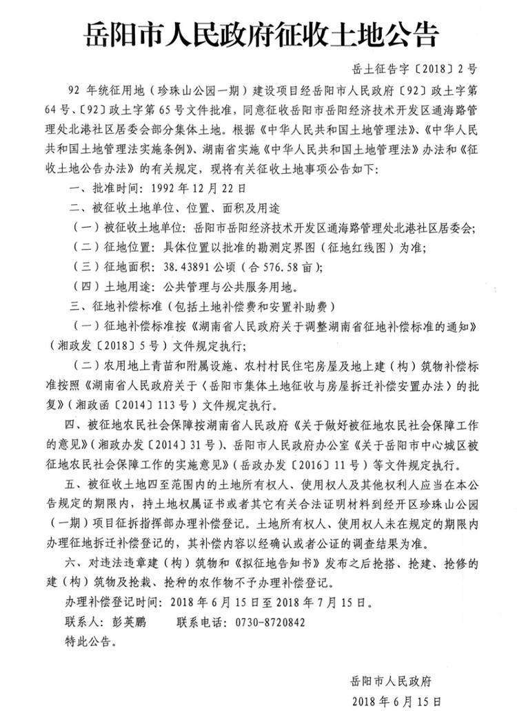 92年统征用地(珍珠山公园一期)建设项目征收土地公告 岳土征告字〔2018〕2号