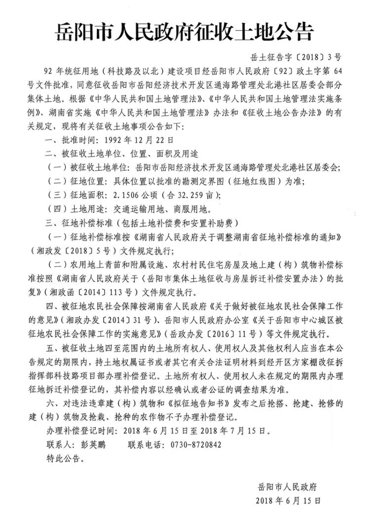 92年统征用地(科技路及以北)建设项目征收土地公告 岳土征告字〔2018〕3号