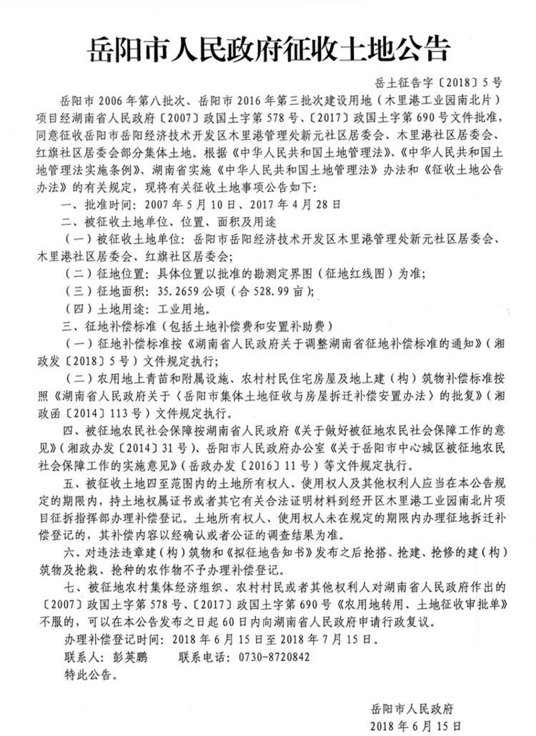 岳阳市2006年第八批次、岳阳市2016年第三批次建设用地(木里港工业园南北片)项目征收土地公告 岳土征告字〔2018〕5号